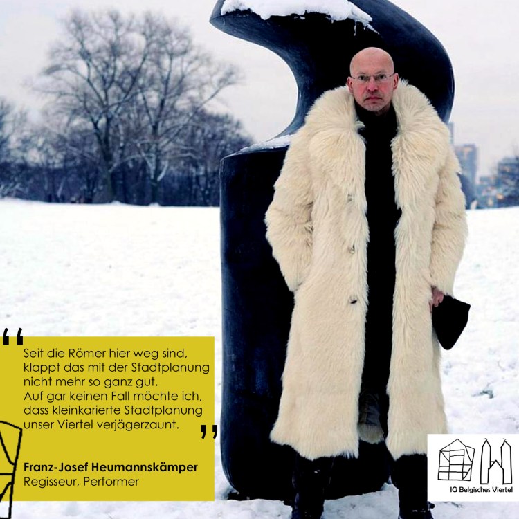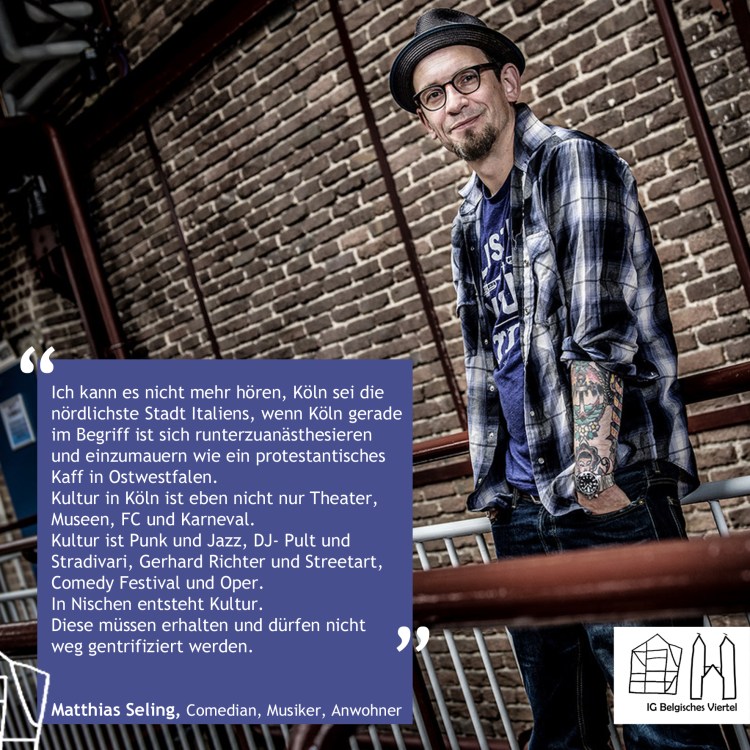 „Als Bewohner des Belgischen Viertels seit mehr als 25 Jahren und aktivem Teilnehmer der kulturellen und vor allem musikalischen Szene hier, kann ich es nur als abwertendes und ignorantes Verhalten von aussen deuten, dass es Fragestellungen gibt, dieses Viertel müde, weichgewaschen und tot zu brandmarken. Mein Leben hier besteht zu einem großen Teil aus Begegnungen der Straße und der Nacht“