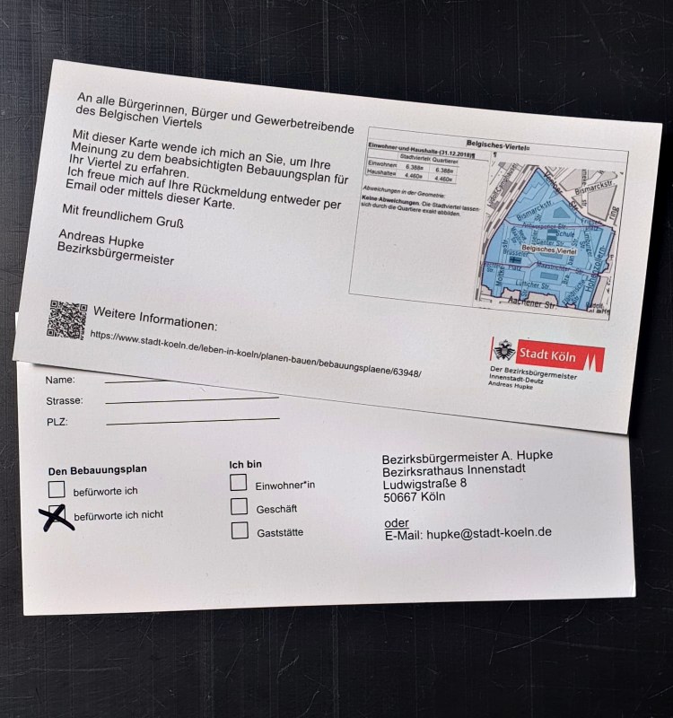 Liebe Unterstützende, einige von Euch werden es ja sicherlich bereits mitbekommen haben, heute morgen wurden von Bezirksbürgermeister Andreas Hupke Postkarten verteilt, auf denen man seine Meinung zum BPlan äußern kann.Auf der einen Seite ist dieses ein deutliches Zeichen dafür, dass unsere Arbeit Früchte trägt und es einigen Befürwortern ganz offensichtlich nicht schmeckt, wie laut und wie viele wir sind. Auf der anderen Seite ist es allerdings ein recht fragwürdiges Unterfangen, auf diese Art und Weise Meinungen einzuholen (Wer wertet die eingegangenen Karten aus? Wer die e-Mails? Wie ist eine neutrale Bearbeitung und Auswertung sichergestellt? Wie repräsentativ soll dieses Werkzeug sein?).Ihr könnt diese Aufforderung von Herrn Hupke aber auch nutzen. Also: Schreibt eine Mail an hupke@stadt-koeln.de und sagt ihm, was ihr von dem BPlan haltet. Wenn ihr das Porto zahlen möchtet (Hr. Hupke übernimmt das leider nicht), füllt die Postkarten aus und schickt sie ihm ebenfalls, damit er sieht, wie viele wir sind.Was Herr Hupke Euch verschweigt, er hat in der Bezirksvertretung Innenstadt im März bereits mit den Grünen, CDU und anderen für diesen BPlan gestimmt. Ist er sich seiner Sache nun doch nicht mehr sicher? Ändern kann er diese Entscheidung der Bezirksvertretung nicht mehr. Die finale Entscheidung liegt am 6. Mai 2021 beim Rat. Aber es wäre doch schön, wenn Herr Hupke am 6. Mai im Rat berichten könnte, dass sich bei ihm die Mehrheit der Bewohnerinnen und Bewohner gegen den BPlan ausgesprochen hat?Daher braucht es nach wie vor Eure Stimmen, damit die Politik versteht, dass sie in dieser Sache für unsere Stadt einen riesen Fehler begeht.