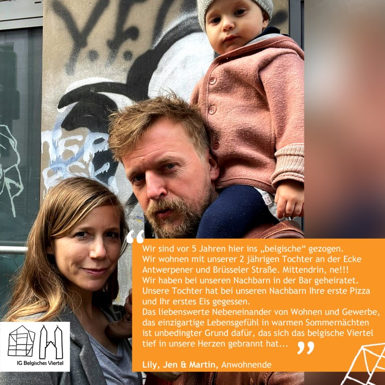 „Wir sind vor 5 Jahren hier ins „Belgische“ gezogen. Wir wohnen mit unserer 2-jährigen Tochter an der Ecke Antwerpener und Brüsseler Straße. Mittendrin, ne!! Wir haben bei unseren Nachbarn in der Bar geheiratet. Unsere Tochter hat bei unseren Nachbarn Ihre erste Pizza und Ihr erstes Eis gegessen. Das liebenswerte Nebeneinander von Wohnen und Gewerbe, das einzigartige Lebensgefühl in warmen Sommernächten ist unbedingter Grund dafür, dass sich das Belgische Viertel tief in unsere Herzen gebrannt hat … „
