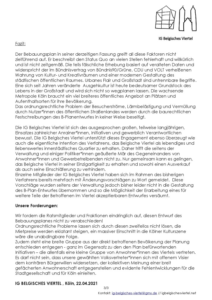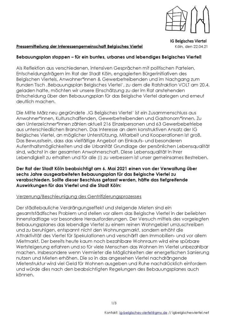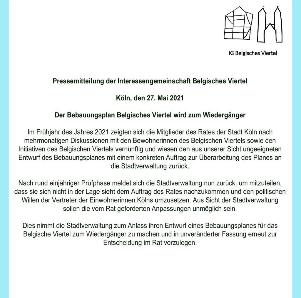 Aktuelle Pressemitteilung IG Belgisches Viertel zum Thema Bebauungsplan Belgisches Viertel – 22.04.21