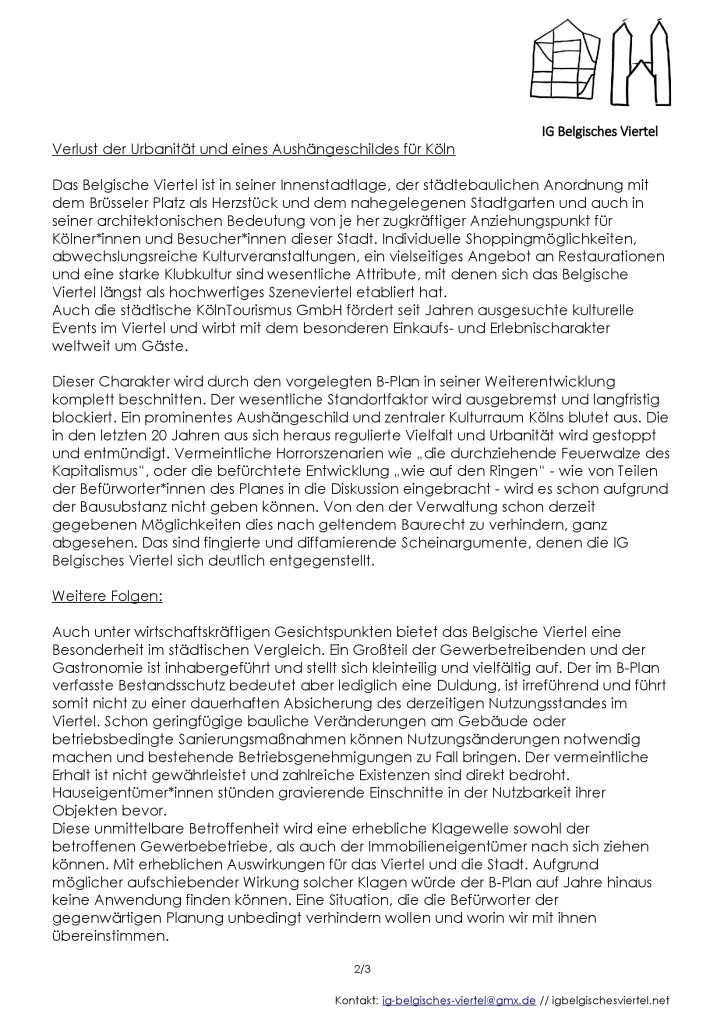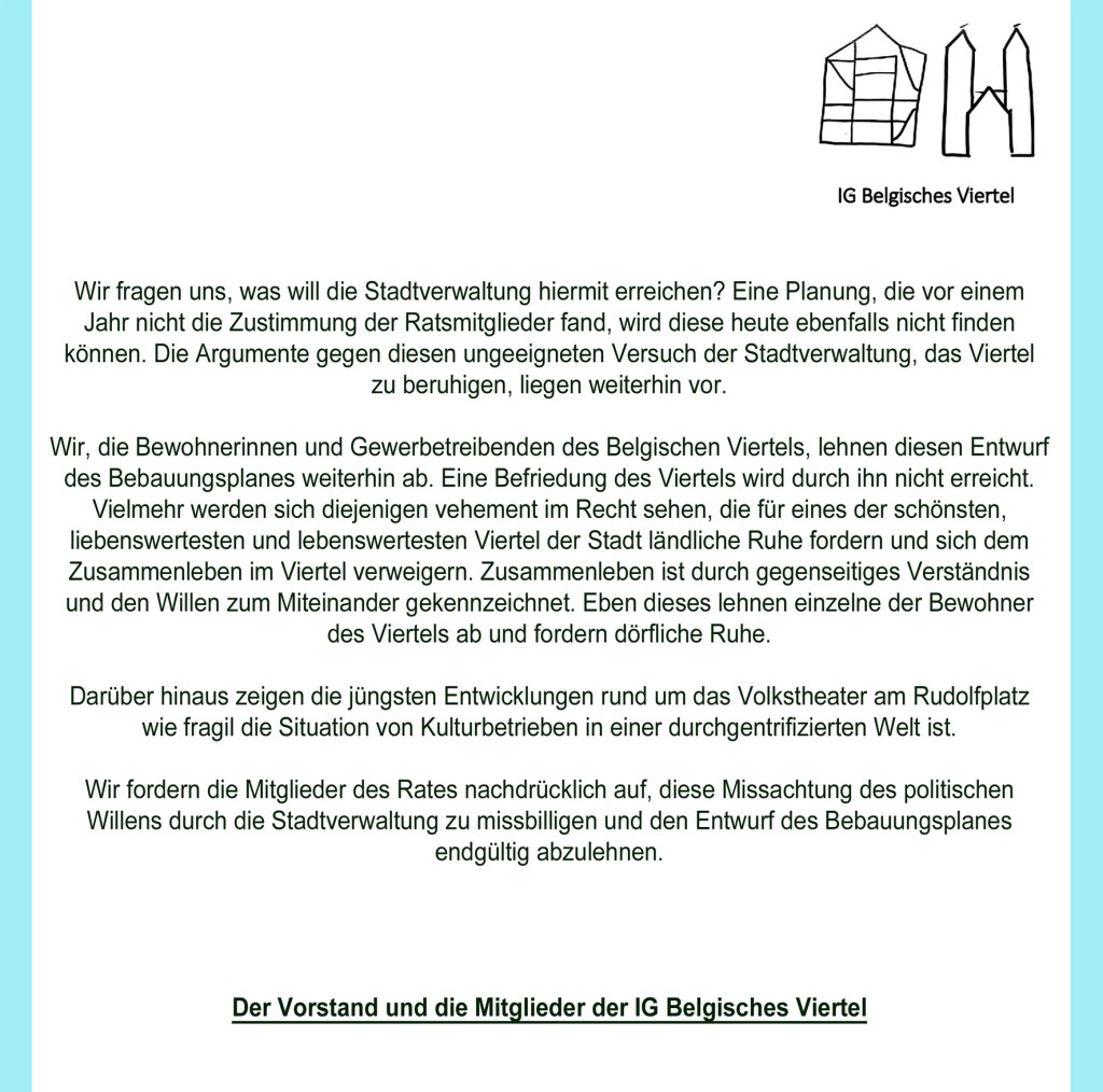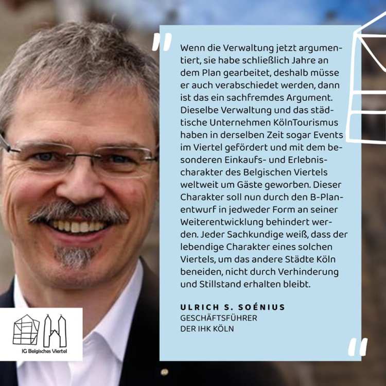 Es ist eine Mär, dass sich nur die Gastronomie oder Gewerbetreibende klar gegen den Bebauungsplan positionieren. Ulrich Soénius ist nicht nur Geschäftsführer der IHK, er ist auch renommierter Kulturpolitiker und Historiker. Seit Jahren sieht er die Pläne der Stadt Köln nicht nur kritisch, immer wieder begründet er seine berechtigte Kritik auch dezidiert. Wir sind der Meinung dass sich hier gerade die wirtschaftstreuen Parteien, FDP Köln und CDU Köln, die Frage stellen müssen, warum auf das Renommee dieses Mannes und die Mahnungen von viele anderen Stimmen nicht gehört wird. Des Weiteren haben sich bis zum heutigen Tag weit über 1500 Menschen, die alle im betroffenen Gebiet wohnen, gegen den Bebauungsplan ausgesprochen und knapp 200 Anwohner/Innen haben sich in unserer Interessengemeinschaft zusammengeschlossen. Das sind überwältigende Zahlen, die Politik und Verwaltung nicht einfach länger aussitzen oder stillschweigen dürfen. Viele Menschen, die hier seit vielen Jahren wohnen, wünschen sich dass die positive Entwicklung im Viertel beibehalten bleibt und auf der deutschlandweiten Karte als Symbol für Lebensfreude, Kultur, Kulinarik und wertvolles Wohngefühl ausstrahlt. Das hat nichts, aber auch garnichts mit den teils ausufernden Versammlungen auf dem Brüsseler Platz, Lärm oder Müll zu tun. Das alles möchte wirklich niemand. Als breites Bündnis aus Anwohnern/Innen, Gewebetreibenden und Menschen mit gesundem Menschenverstand appellieren wir nochmal eindringlich an alle Kräfte in dieser Stadt, die Entscheidungen treffen können und wollen: Verhindern Sie diesen Bebauungsplan und setzen Sie sich mit uns allen an einen Tisch um vernünftige Lösungen zu erarbeiten und zu entwickeln. Es geht um nicht mehr und nicht weniger als die Entscheidung ob Köln eine lebenswerte Stadt für alle bleibt.