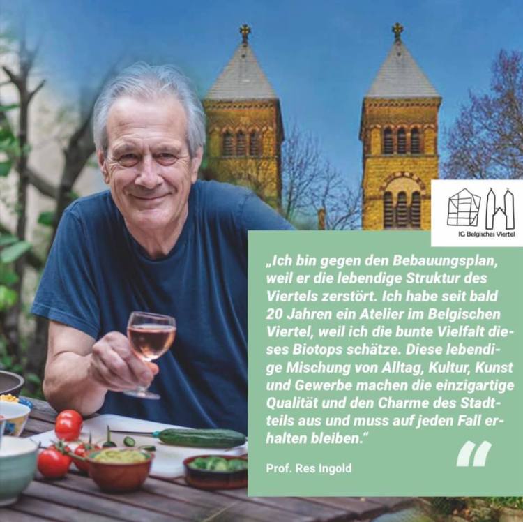 „Ich bin gegen den Bebauungsplan, weil er die lebendige Struktur des Viertels zerstört. Ich habe seit bald 20 Jahren ein Atelier im Belgischen Viertel, weil ich die bunte Vielfalt dieses Biotops schätze. Diese lebendige Mischung von Alltag, Kultur, Kunst und Gewerbe machen die einzigartige Qualität und den Charme des Stadtteils aus und muss auf jeden Fall erhalten bleiben.“