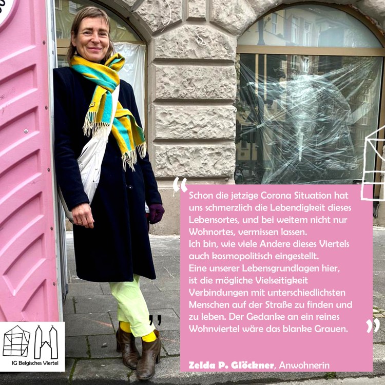 „Schon die jetzige Corona Situation hat uns schmerzlich die Lebendigkeit dieses Lebensortes, und bei weitem nicht nur Wohnortes, vermissen lassen.Ich bin, wie viele Andere dieses Viertels auch, kosmopolitisch eingestellt. Eine unserer Lebensgrundlagen hier, ist die mögliche Vielseitigkeit, Verbindungen mit unterschiedlichsten Menschen auf der Straße zu finden und zu leben. Der Gedanke an ein reines Wohnviertel wäre das blanke Grauen.“